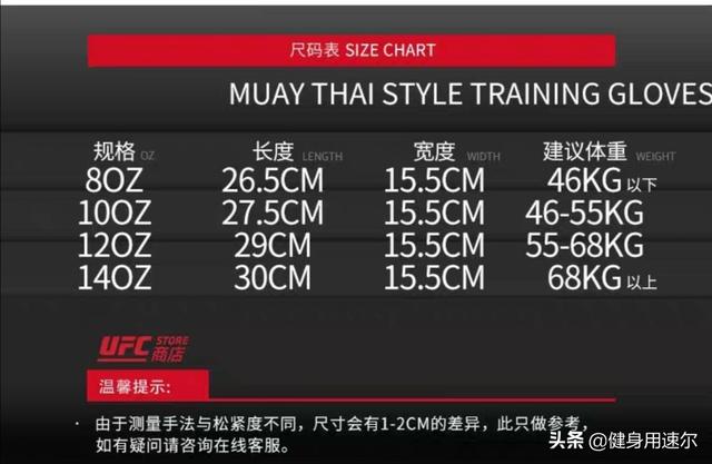 如图,可以根据个人手的大小和尺寸进行拳套选择。职业拳击比赛使用的是8-10oz的手套。有教练建议,用10、12oz的去打手靶、找手感,用14,16oz的手套打重沙包或实战,这样有更好的保护。也有建议一副填充紧实的打沙包,一副较软的打实战。