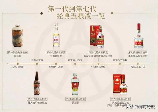 第一代经典五粮液诞生于1909年,出现了历史上唯一的陶瓶装,标签上绘制具象的五种粮食展现“五粮”品牌,并一直活跃到1935年。第二、第三代普五均采用玻璃瓶,第四代普五采用萝卜瓶包装。