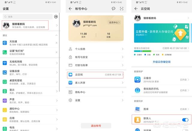 打开华为云空间的方法很简单,在“设置”中点击自己的用户帐号(没有帐号先注册一个),然后在帐号中心中选择“云空间”,再打开“数据同步”中的联系人。这样一来,手机通讯录中的联系人电话等信息,就会自动同步到云端。而且每次新增和修改联系人之后,云端的数据也会同步更新。