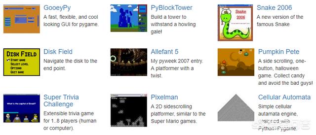 3.更多小游戏的话,可以直接到pygame官网查看,非常多,常见的俄罗斯方块、纸牌、贪吃蛇、五子棋等都有,如下: