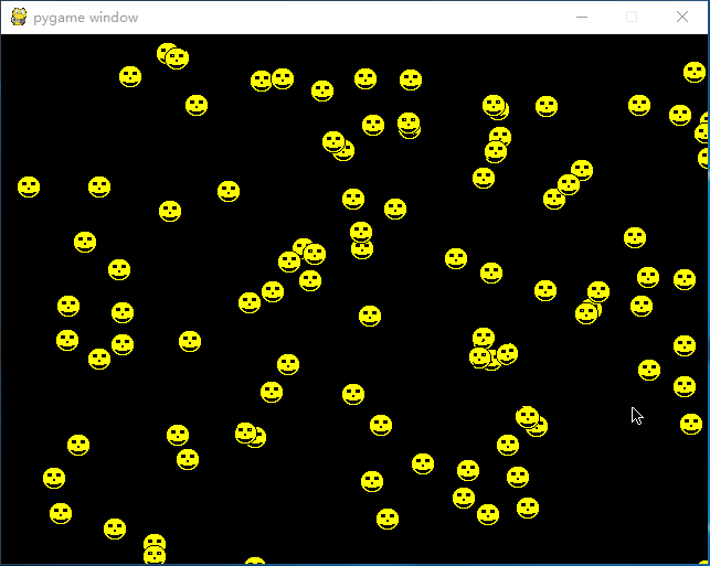 第三个示例,testsprite.py这个脚本,也直接运行命令“python testsprite.py”就行,程序运行效果如下,随机跑动的一些笑脸,也比较简单: