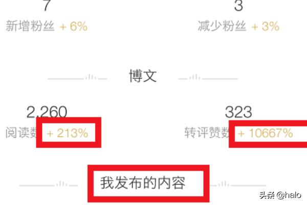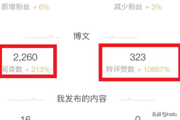 5、同时在这个界面中,我们还能看到前一日的转评赞数以及阅读数相较于在前一日的增长的百分比,以及粉丝变化,我发布的内容等其他数据。