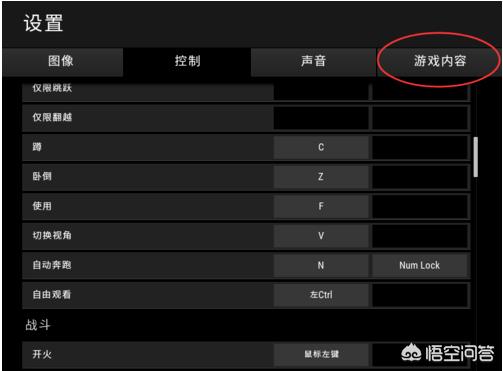 4、我们在设置好了鼠标瞄准右键之后还有一个非常关键的设置,点击设置里的游戏内容。