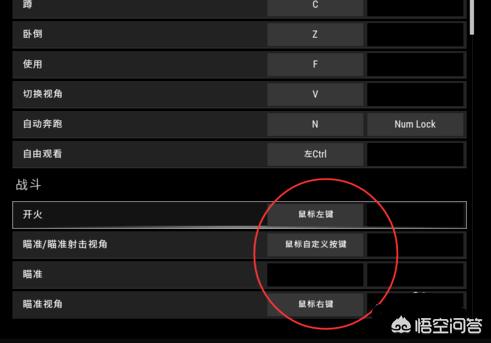 3、下拉找到战斗设置,在这个设置里我们吧鼠标瞄准视角设置为鼠标右键。瞄准和瞄准射击视角改成其他的按键。