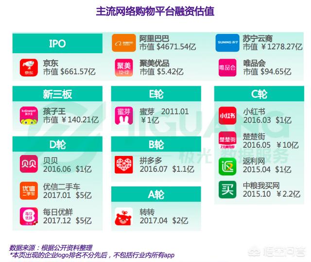 融资方面,目前,阿里巴巴、京东等网络购物头部平台已完成 IPO 上市,阿里巴巴目前总市值为 4671.54 亿美元,京东为 661.57 亿美元,小红书、贝贝、优信二手车、每日优鲜、拼多多等细分类别平台也进入 B 轮及以后融资阶段。