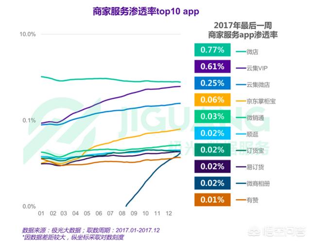 在商家服务 app 领域,截至 2017 年最后一周,微店渗透率为 0.77%,云集 VIP 为 0.61%,云集微店为 0.25%。