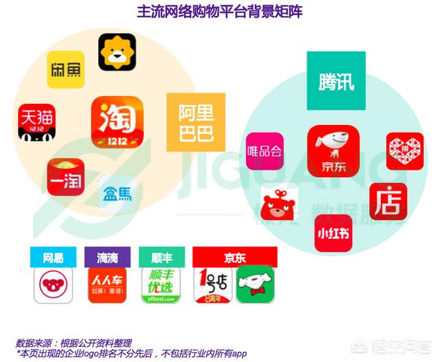 根据公开资料显示,淘宝、苏宁易购、闲鱼、天猫等背后皆有阿里巴巴背景,腾讯则投资了京东、唯品会、拼多多等网络购物平台,此外,网易、滴滴、顺丰等也通过多种方式进军网络购物行业。