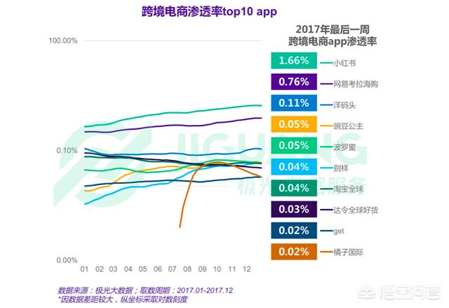 据中国电子商务中心统计,2017 年跨境进口电商平台中,按整体交易额计算,网易考拉市场占有率为 21.4%,天猫国际为 17.7%,唯品国际以 16.1% 紧随其后。根据极光大数据统计,截至 2017 年最后一周,小红书渗透率为 1.66%,网易考拉为 0.76%。