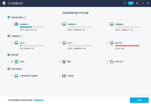 步骤2、选择数据文件删除或丢失的位置,单击“开始”按钮进行处理。