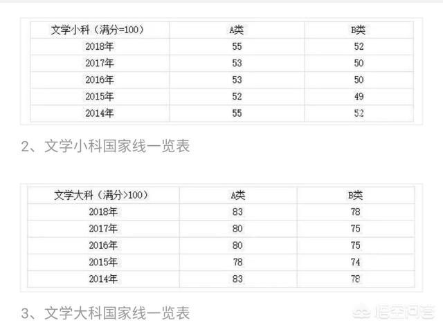 2014、2016年最高,A类考生350分,B类考生340分。2017年,2018年国家线保持稳定,A类考生均为345分,B类考生均为335分。2018年A类、B类考生文学小科、文学大科考生与2017年相比均增加2分。