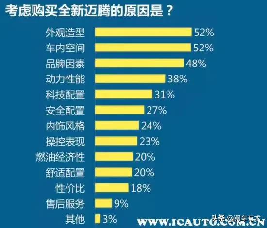 在59%考虑购买的人群当中,外观造型和车内空间成为他们选择全新迈腾的主要因素,其中在外观方面,相比老款车型变化明显,整体延续了欧版第八代Passat的设计元素,并采用了全新的家族式前脸设计以及线条感更强的前后灯组,造型更加时尚前卫动感,另外外形上的改变也能够与现款帕萨特区分开来,并吸引更多年轻消费群体的关注,这些要素可以看出男人开迈腾有档次。