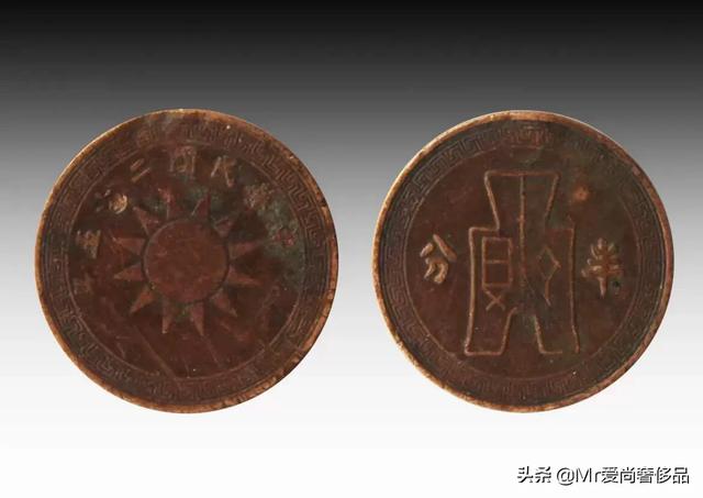 民国二十五年国民政府开始铸造发行以分为单位的机制钱币,这种钱币作为法币的辅币进行流通。主要图案以方足布和青天白日旗为主,边饰以回纹,形制整齐划一,是我国铜圆史上唯一大规模发行的规范化铜圆。这种铜圆最初流通时可以兑换旧式十文铜圆三枚,民国二十五年还有半分一种,相对壹分来说要多见一点。