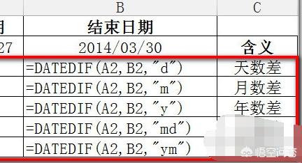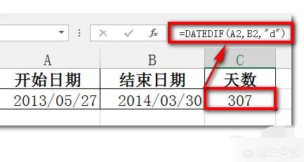 2.计算两个日期之间的天数,也可以用隐藏函数DATEDIF函数来完成,公式如下=DATEDIF(A2,B2,"d")。