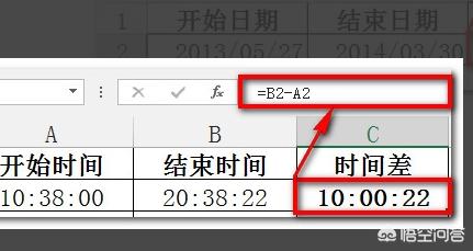 4.下面再来看一下如何计算时间。首先,最简单的是两个时间直接相减即可得到时间差。但是注意,存储结果的单元格要设置成时间格式。这样就解决了excel计算到期日的问题了。