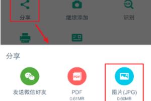 9.如果需要分享或者保存到手机,可以点击【分享】,出现窗口,点击【图片】就可以保存到手机上了,这样纸质文件就扫描成电子版扫描件了。