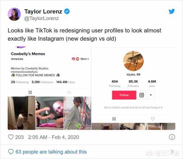 TikTok正在测试一个针对用户档案的重新设计,看起来跟Instagram非常相似。新的个人文件将把头像和粉丝数量移到左边。《纽约时报》记者Taylor Lorenz最先发现了这一设计。一位TikTok发言人则向The Verge网站证实,该公司正在进行测试新设计。