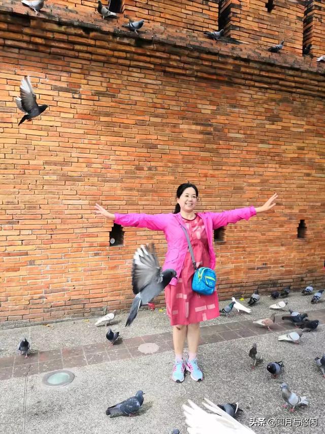 第二天,我们坐双条车,一个人20泰铢(人民币4元多)去了宁曼路,小清新很美,又换了一些泰铢。晚上步行来到了古城塔佩门,塔佩门古老的城墙,在夕阳映衬下,很有异国风情,还有一群鸽子,鸽子不怕人,会飞到游人肩上、手上、头上,好玩极了。