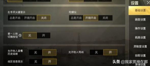 2、在“基本设置”处,我们关闭“左手开火键显示”,陀螺仪选择开镜开启。
